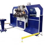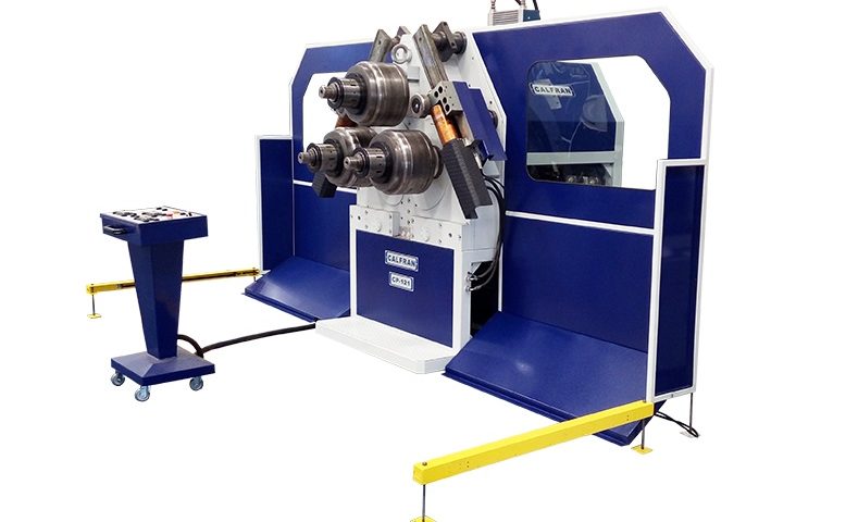 Calandra de perfil com aperto hidraulico, movimento de aperto dos rolos inferiores, com guias laterais, possue opcionais para comando CNC e ferramentas especiais.